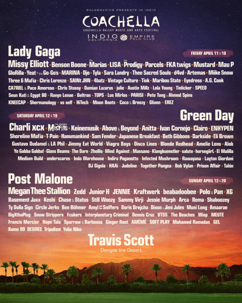 Obično organizatori festivala ne otkrivaju program do januara, ali glasine su kružile već nedeljama, a sada je čitava stvar obelodanjena. Juče je Post Malone otkrio vest da će preuzeti hedlajnersku dužnost u nedelju. A, sada je objavljeno da će ostali hedlajneri biti Lady Gaga, Green Day i Travis Scott. Nastuprot mnogim predviđanjima, Fred again.. nije na spisku učesnika, ali mnogi drugi jesu.