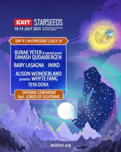 Teslin dan 10. jula pojačava i australijska producentkinja, DJ-ica i kantautorka Alison Wonderland sa svojim projektom Whyte Fang, kojim slušaoce i publiku vešto uvodi dublje u svoj unutrašnji svet. Nulti dan EXIT festivalaosvojiće i beskompromisni pobednik u izboru evropske, ali i svetske evrovizijske publike Baby Lasagna. Pravo sa velike evrovizijske bine stiže i srpska predstavnica Teya Dora, autorka moćne balade „Ramonda”! Kantautorka, pijanistkinja, kompozitorka, i producentkinja postala je internet fenomen pesmom „Džanum”, koja broji 84 miliona strimova na YouTube platformi.