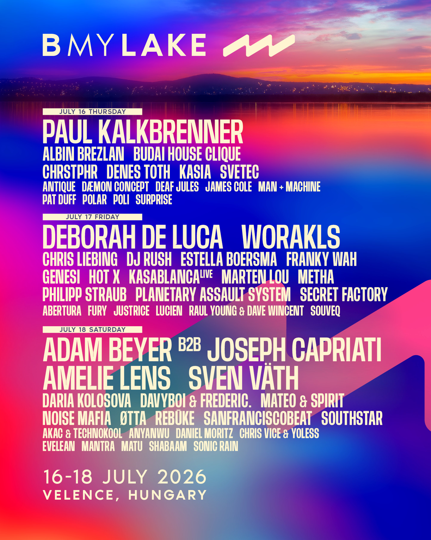 Mađarski B my Lake je festival elektronske muzike sa dugogodišnjom tradicijom. Poslednjih nekoliko godina bili su u sastavu Balaton Sounda, međutim kako se taj festival neće održati ove godine, B my Lake se ponovo osamostalio. Nova lokacija je plaža u gradiću Velence.
