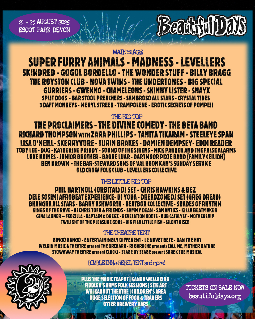 Festival Beautiful Days održava se u Escot Parku u Devonu. U organizaciji benda Levellers, u pitanju je porodični festival sa sedam bina, neverovatnom umetničkim delima, ogromnim prostorom za decu, komedijom, pozorištem, porodičnim kampovanjem, pivskim barovima i širokim izborom štandova sa hranom i zanatima.