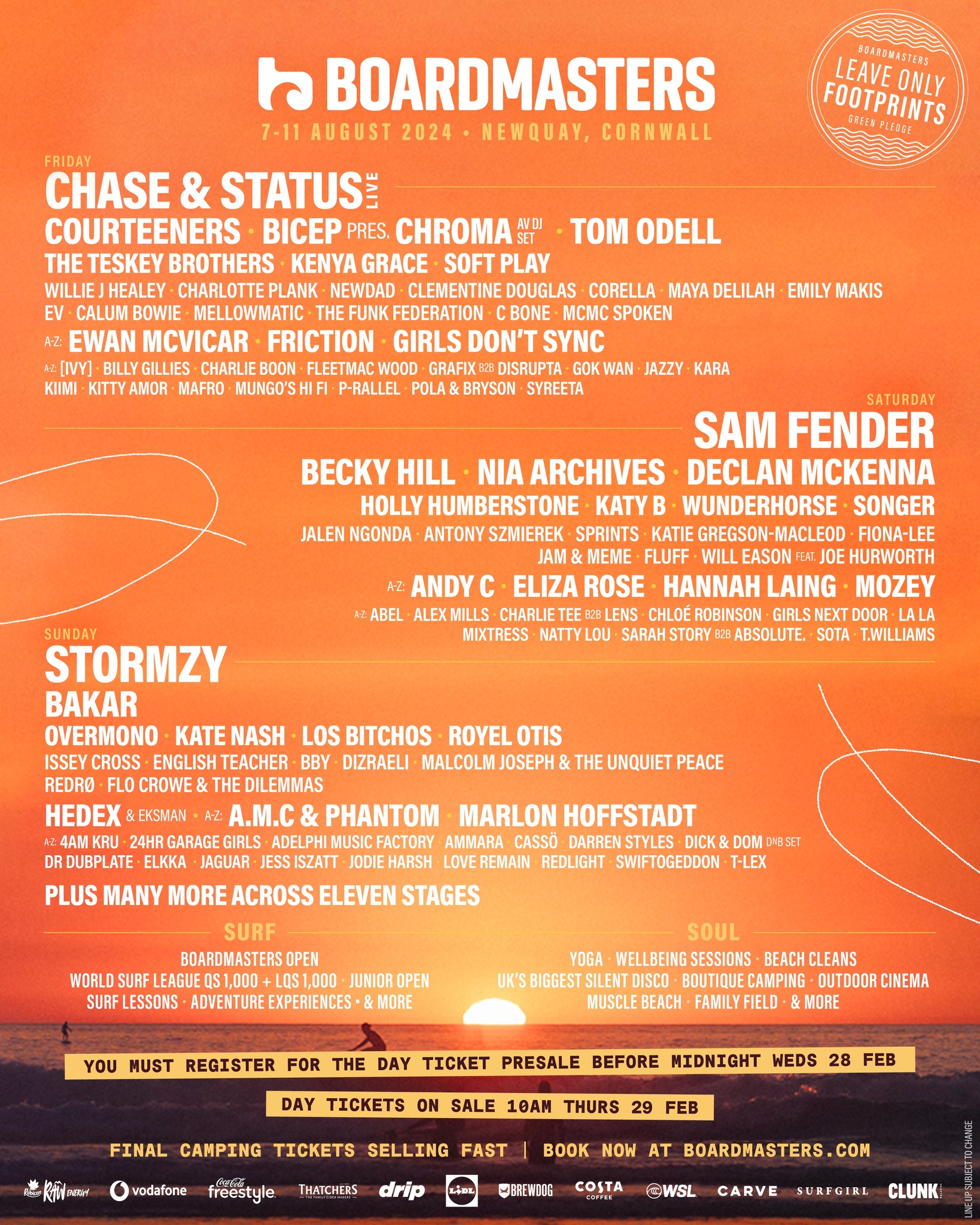 Boardmasters spaja preko 200 muzičara koji nastupaju na dvanaest pozornica pored plaže u Kornvolu sa profesionalnim surferima koji se takmiče na svetskom nivou.