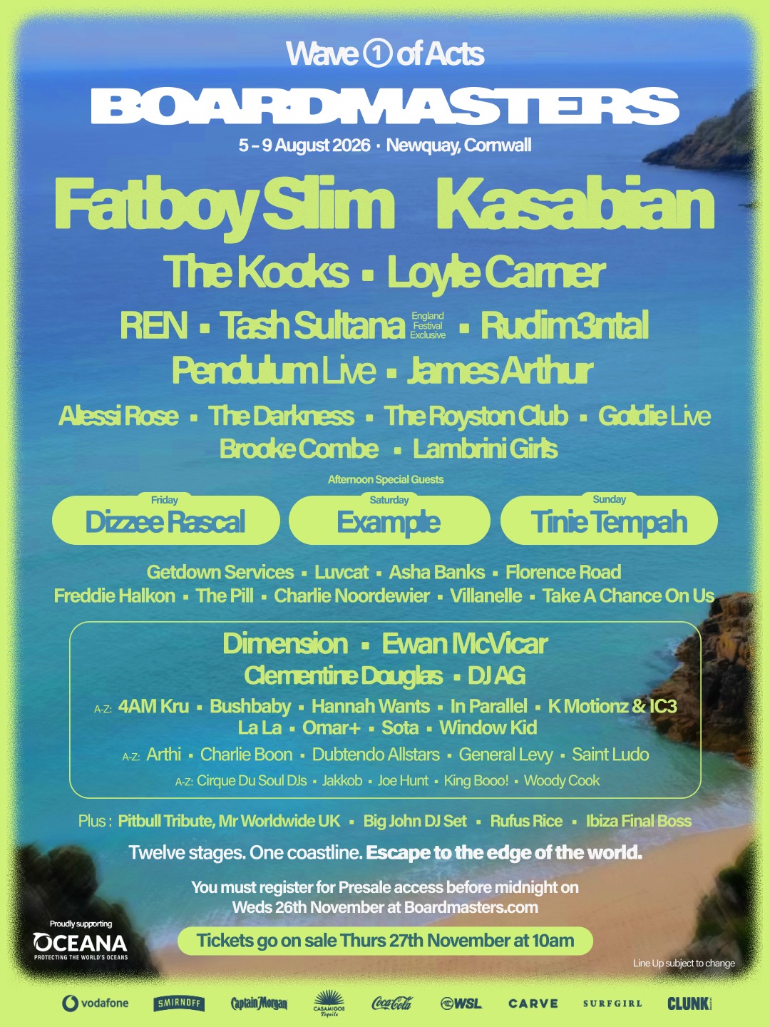 Boardmasters spaja preko 200 muzičara koji nastupaju na dvanaest pozornica pored plaže u Kornvolu sa profesionalnim surferima koji se takmiče na svetskom nivou.