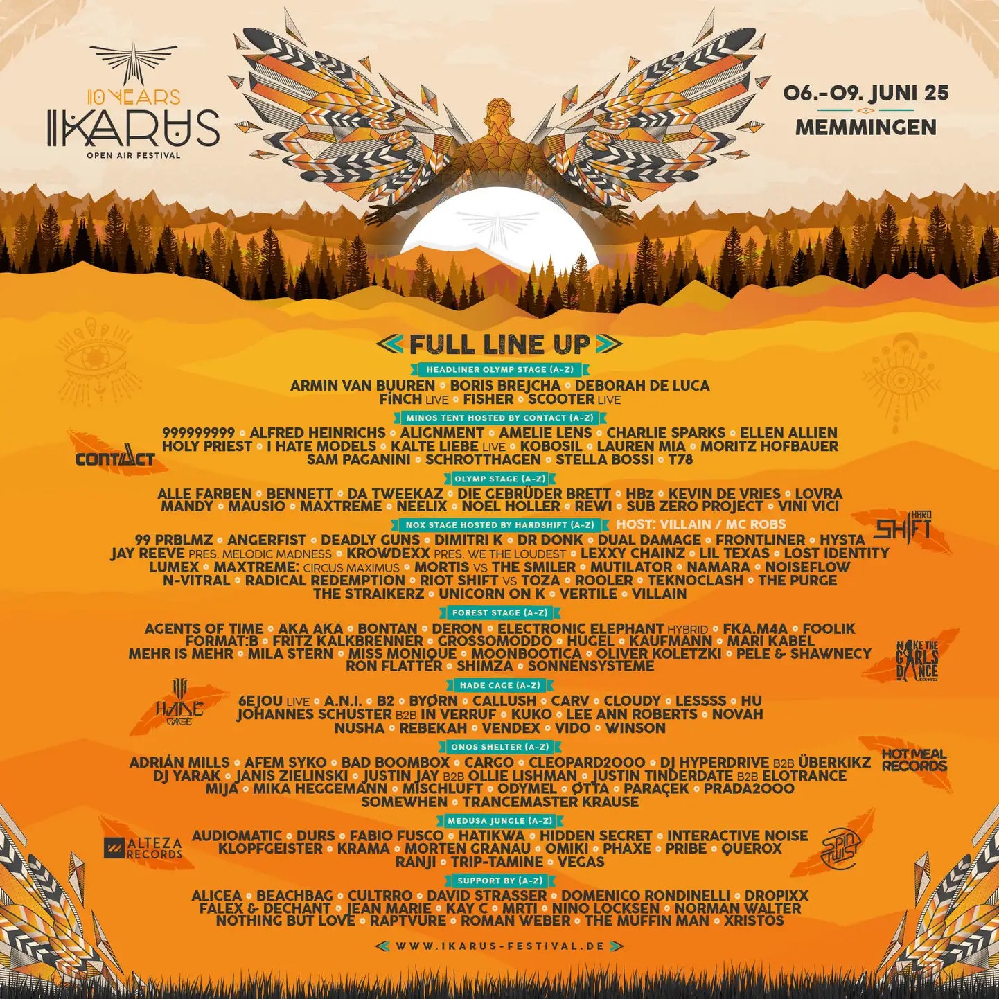 Ikarus se odvija na idiličnoj i podjednako jedinstvenoj lokaciji: bivšem vojnom aerodromu, prošaranom bujnim šumama i mračnim skloništima. Savršeno za muzički spektakl kakav nikada ranije niste doživeli. Bezbroj nacionalnih i međunarodnih izvođača koji pružaju najbolji elektronski zvuk na 7 bina svih vrsta do ranih jutarnjih sati.