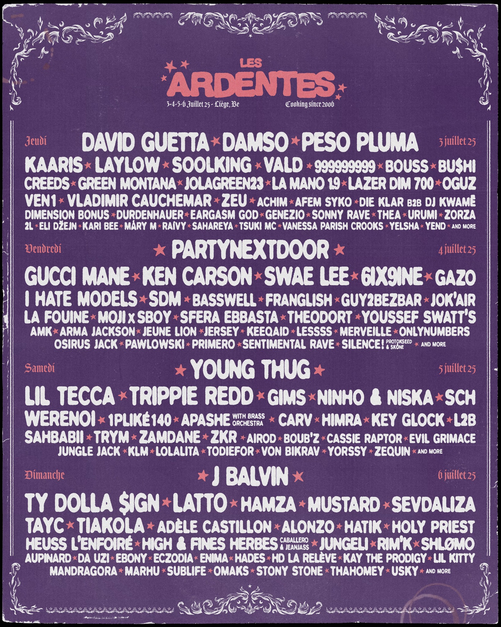 Les Ardentes je četvorodnevni događaj koji uz neverovatan muzički program privlači posetioce zbog fantastičnog okruženja nadomak reke Meze u Liježu. Belgijski festival uglavnom dovodi najzvučnija imena sa globalne hiphop scene, ali i respektabilne predstavnike EDM i pop muzike.
