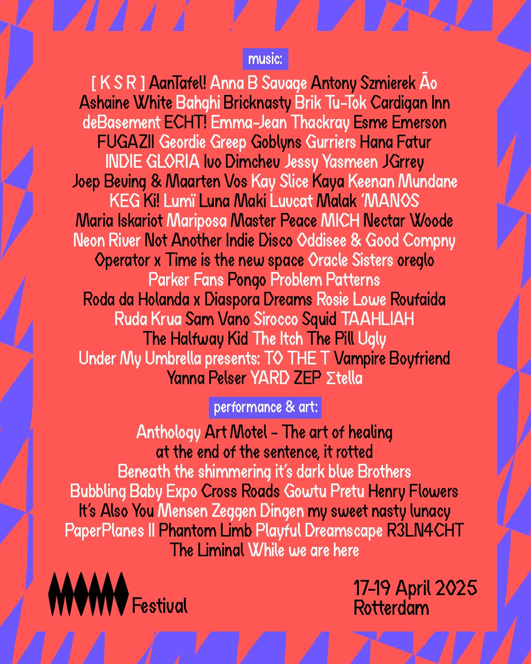Motel Mozaique nudi program sačinjen od uzbudljivih umetnika/performera, ali iznad svega muzičkih stvaralaca. Lajnap vrvi od talentovanih izvođača koje samo čekaju da ih otkrijete. MOMO avantura odigrava se na više različitih lokacija u Roterdamu.