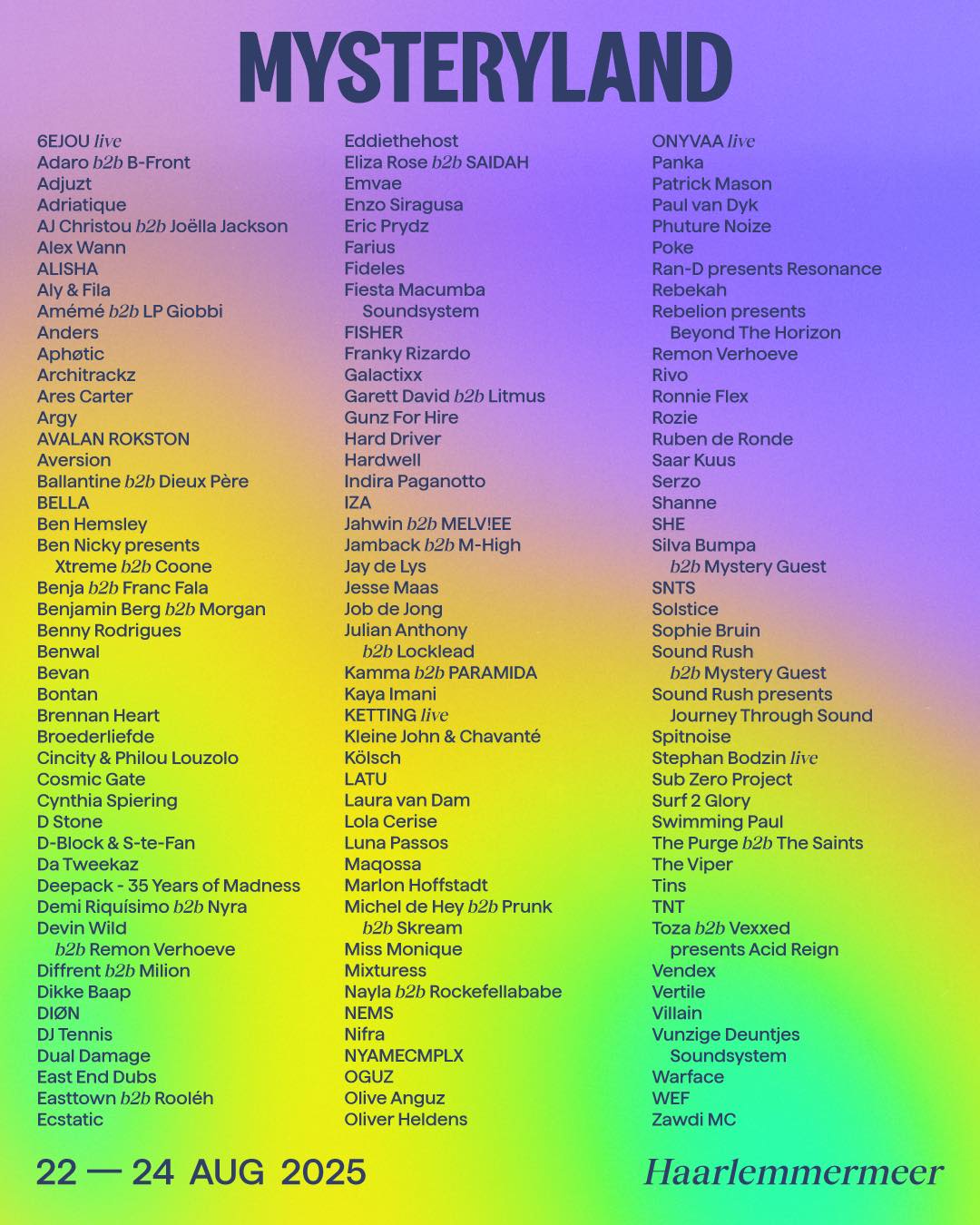 Održavajući se na periferiji Amsterdama već više od 25 godina, ovaj festival ovde promoviše najbolje u elektronskom žanru. Ponosno predstavlja lajnap sastavljen od najvećih i najboljih izvođača iz širokog spektra elektronskih žanrova, EDM, house, techno i mnogi drugi koji su zastupljeni, tako da Mysteryland letnje odredište za brojne fanove.