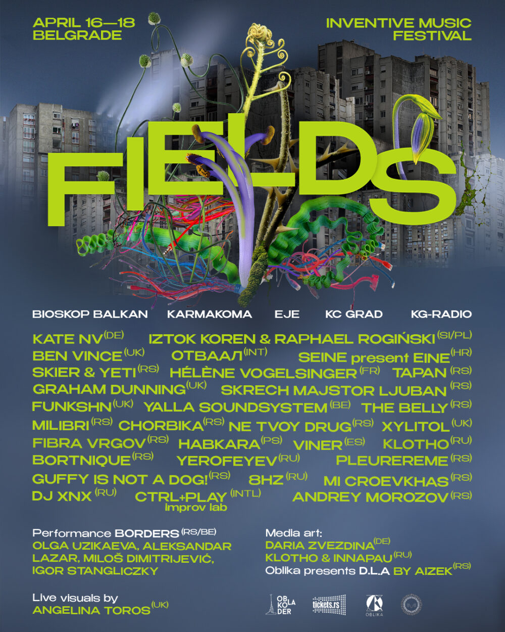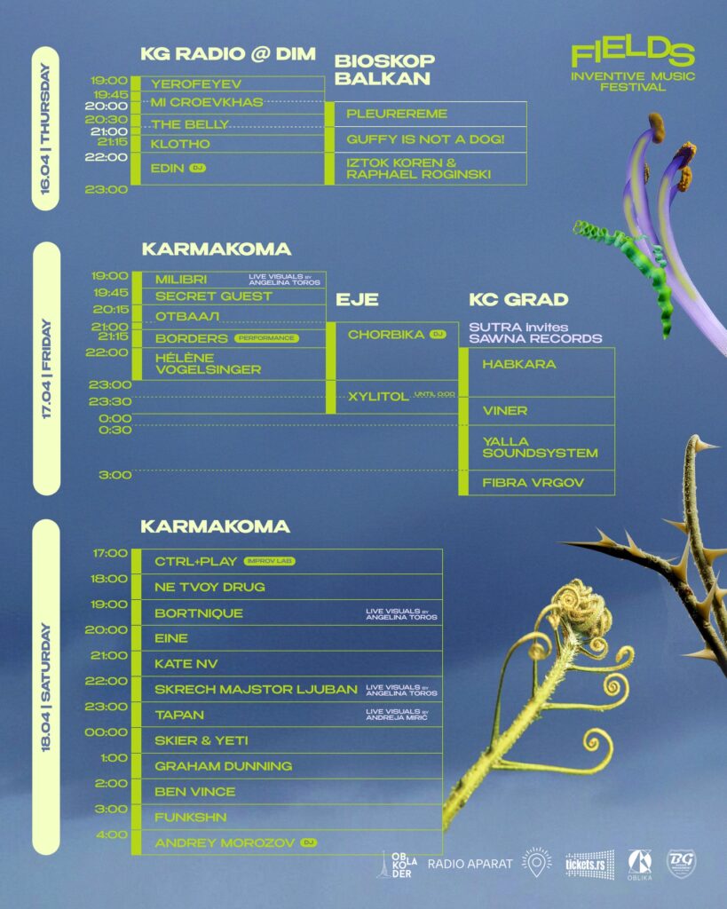 Festival Fields se vraća u Beograd. Festival inovativne muzike održaće se od 16. do 18. aprila na nekoliko gradskih lokacija kao što su Bioskop Balkan, Karmakoma i EJE Belgrade.