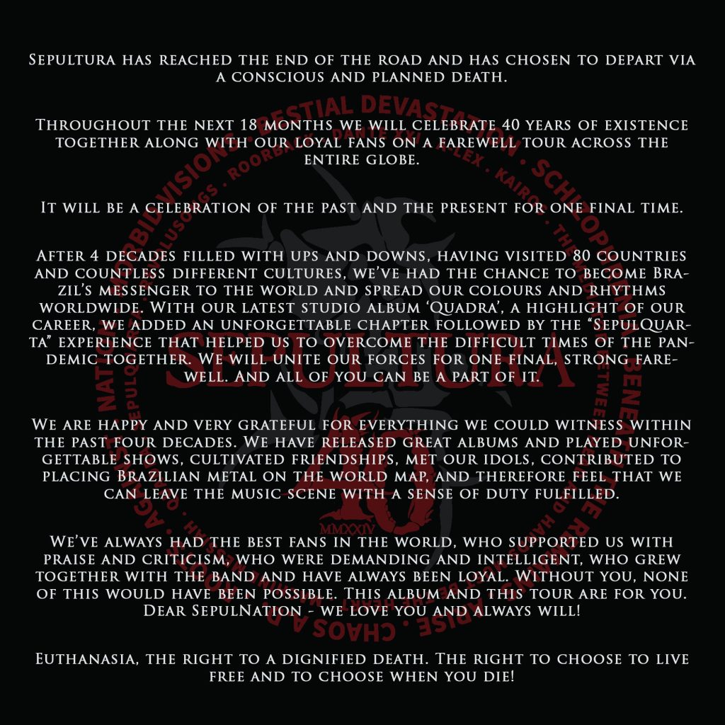 Kultni sastav Sepultura prestaje sa radom. Brazilski thrash metal veterani otkrili su da će se otisnuti na 18-mesečnu oproštajnu svetsku turneju. Serija koncerata uključivaće i evropske datume na jesen 2024. godine.