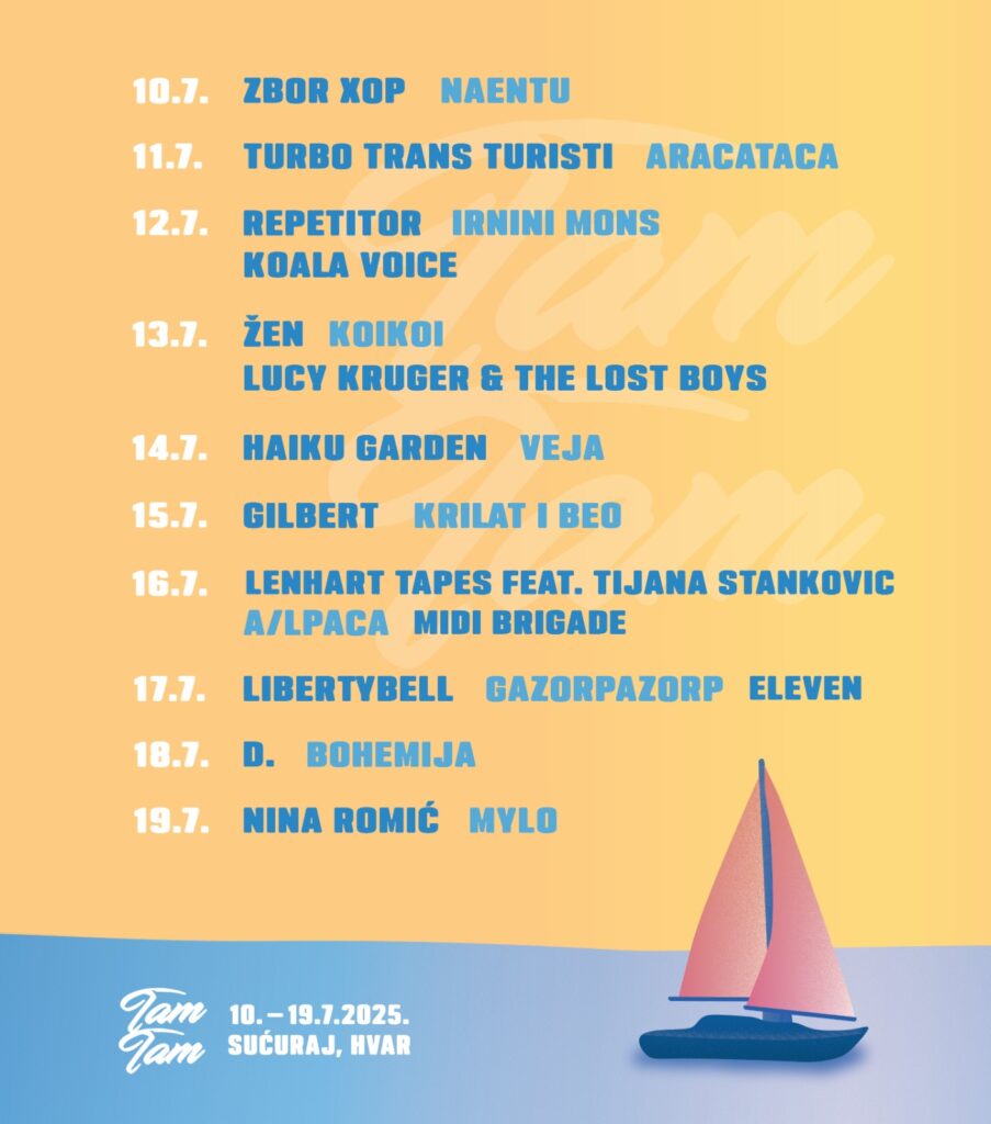 Dvanaesto izdanje TAM TAM festivala biće održano od 10. do 19. jula u Sućurju na krajnjem istoku ostrva Hvar. Tokom godina TAM TAM je izrastao iz okupljališta muzičara u događaj koji je stekao reputaciju jednog od najboljih malih festivala u regionu. Ostrvo Hvar, zahvaljujući ovom festivalu, tradicionalno deset dana leta postaje utočište za sve ljubitelje nezavisne regionalne muzike.